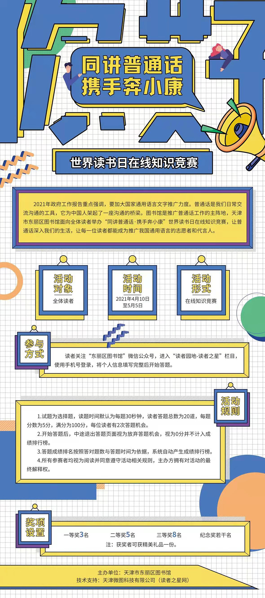 为迎接4.23世界读书日的到来,东丽区图书馆将面向全体读者举办“同讲普通话·携手奔小康”世界读书日在线知识竞赛。图书馆作为推广普通话工作的主阵地,通过活动让普通话深入我们的生活,让每一位读者都能成为推广我国通用语言的志愿者和代言人。活动将于4月10日零时开始,图书馆为大家准备了丰厚的奖品,希望大家踊跃参加!