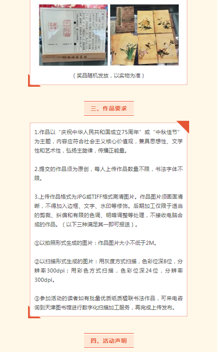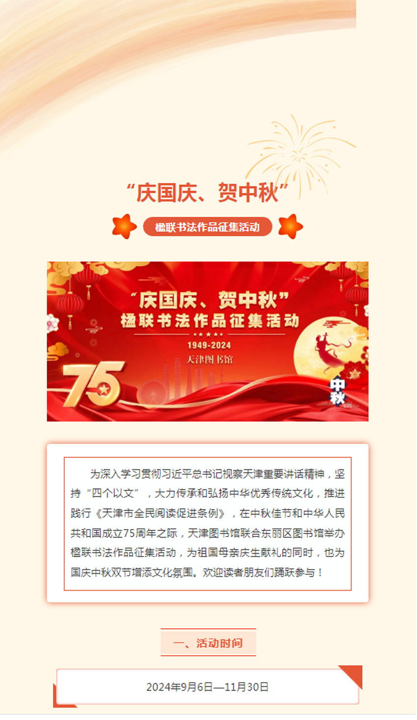 【活动通知】| 天津图书馆举办“庆国庆、贺中秋”楹联书法作品征集活动