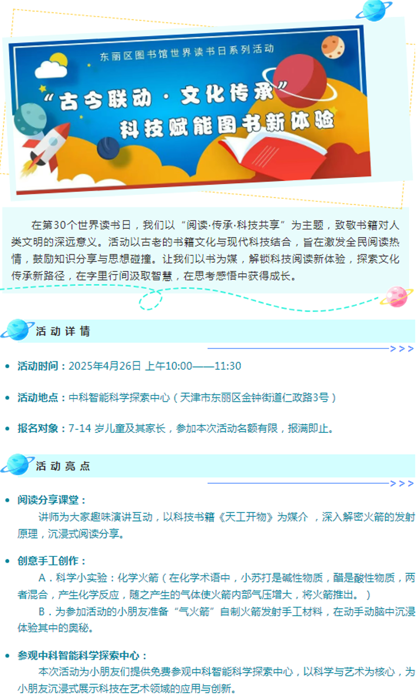 【活动通知】| 我们的中国梦·文化进万家——东丽区图书馆4.23系列活动之“古今联动·文化传承”:科技赋能图书新体验活动报名中