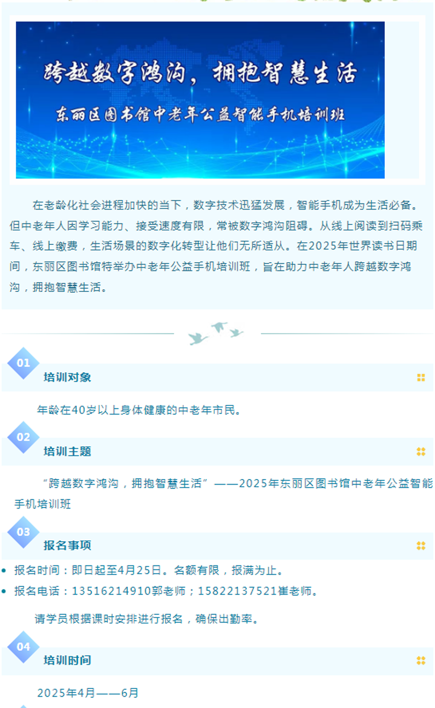 【活动通知】| 我们的中国梦·文化进万家——东丽区图书馆4.23系列活动之2025年中老年公益智能手机培训班开始报名啦!