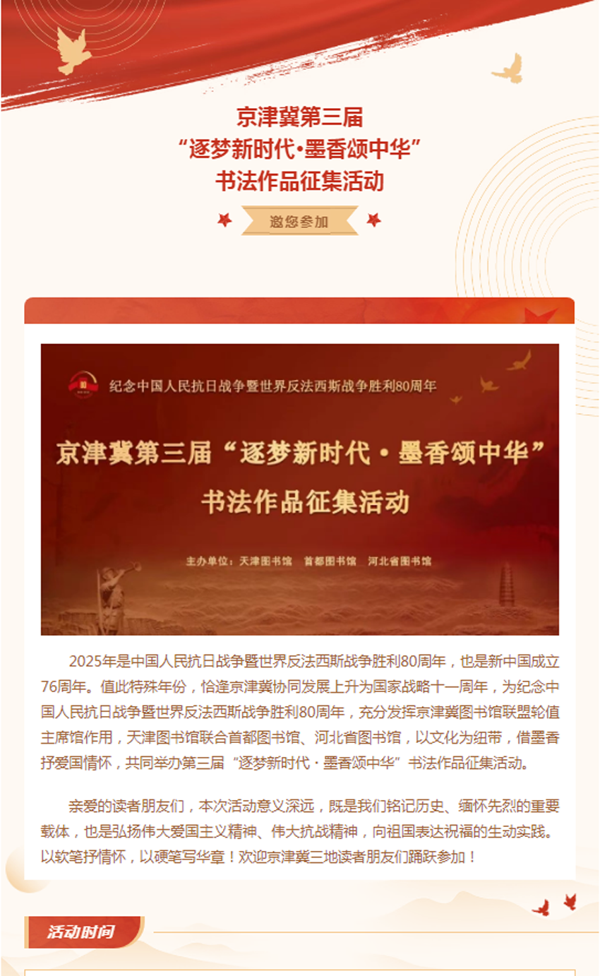 【活动通知】| 纪念中国人民抗日战争暨世界反法西斯战争胜利80周年——京津冀第三届“逐梦新时代·墨香颂中华”书法作品征集活动