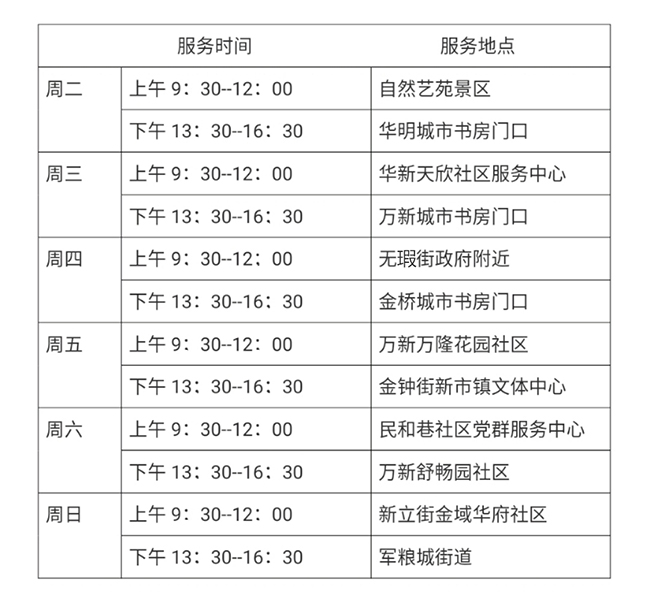 9月8日—9月13日流动图书车服务时间地点公布如下,如有社区、单位需要图书车上门服务请与杜俊老师联系,联系电话:18522291388。