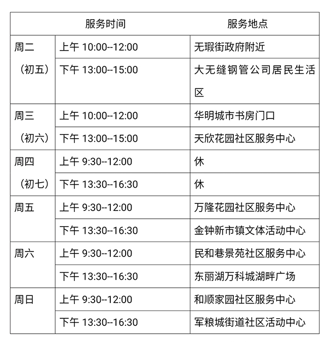 2月9日—2月21日流动图书车服务时间地点公布如下,如有社区、单位需要图书车上门服务请与杜俊老师联系,联系电话:18522291388。