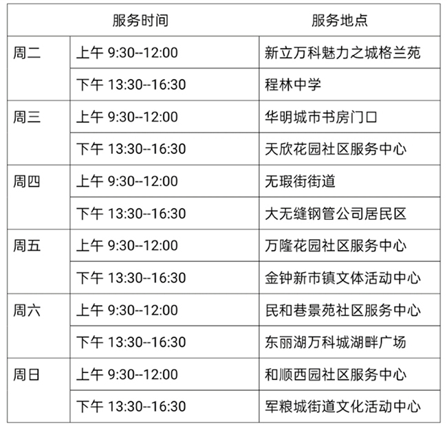 3月30日—4月4日流动图书车服务时间地点公布如下,如有社区、单位需要图书车上门服务请与杜俊老师联系,联系电话:18522291388。