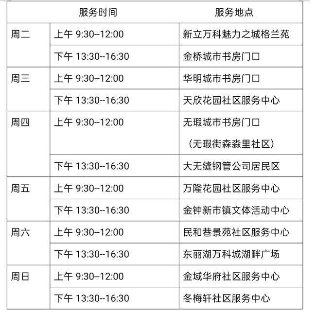 8月3日—8月8日流动图书车服务时间地点公布如下,如有社区、单位需要图书车上门服务请与杜俊老师联系,联系电话:18522291388。