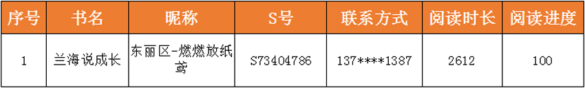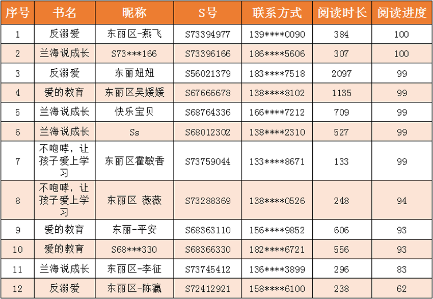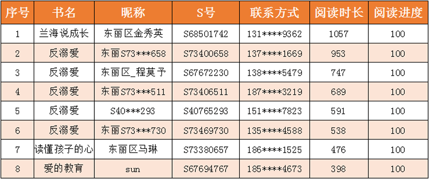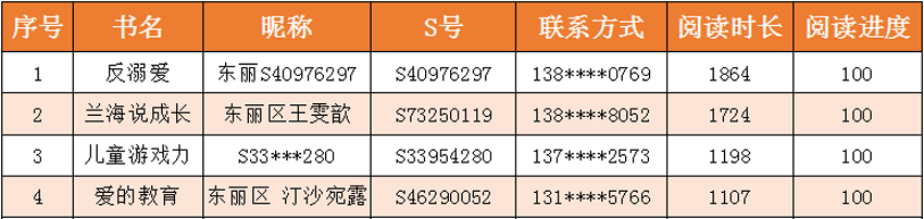 为充分发挥家庭在孩子健康成长过程中的重要作用,真正让孩子们与书为友,益智明理,从读书中吸取精华,东丽区图书馆联合东丽区妇联共同举办的“爱在东丽 为爱阅读”——爱的教育线上共读活动,经过11月8日—11月28日的共读期和11月29日—12月5日的评奖期,已圆满结束,212人加入了共读,共读书目时长达到了70655分钟(1177.5小时)。现将获奖情况公布如下: