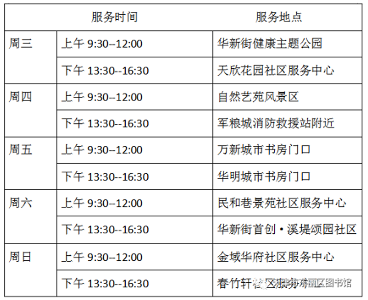 8月31日—9月4日流动图书车服务时间地点公布如下,如有疫情随时调整。社区、单位需要图书车上门服务请与杜俊老师联系,联系电话:18522291388。