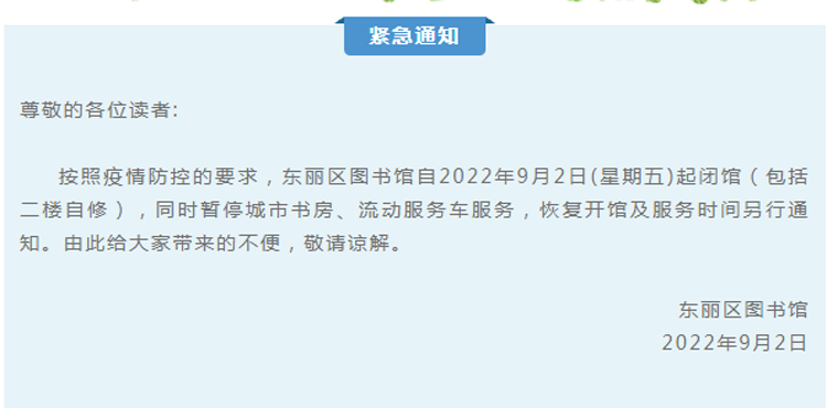 东丽区图书馆闭馆公告