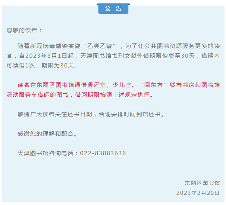 重要通知 | 天津图书馆关于恢复调整书刊外借期限的通知