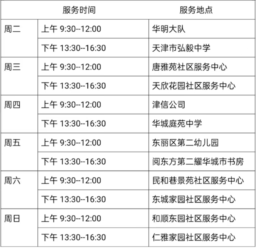 5月30日—6月4日东丽区图书馆流动服务车服务时间地点公布如下。社区、单位需要服务车上门服务请与杜俊老师联系,联系电话:18522291388。