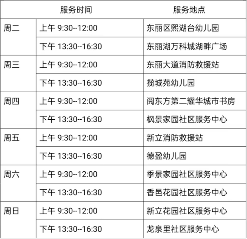 9月12日—9月17日东丽区图书馆流动服务车服务时间地点公布如下。社区、单位需要服务车上门服务请与杜俊老师联系,联系电话:18522291388。