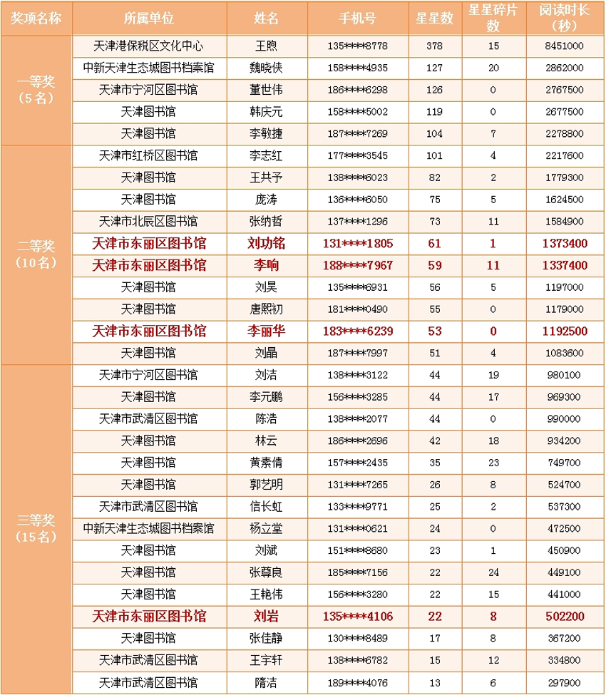 本次活动共吸引天津地区1777名读者参与,平台根据读者的星星点亮数统计排名,天津地区前30名读者获奖。现将获奖名单公布如下: