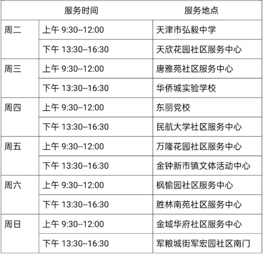 9月26日—10月1日东丽区图书馆流动服务车服务时间地点公布如下。社区、单位需要服务车上门服务请与杜俊老师联系,联系电话:18522291388。
