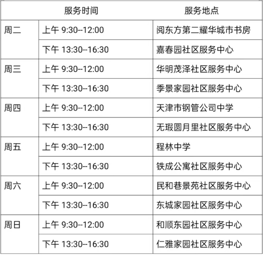 10月17日—10月22日东丽区图书馆流动服务车服务时间地点公布如下。社区、单位需要服务车上门服务请与杜俊老师联系,联系电话:18522291388。