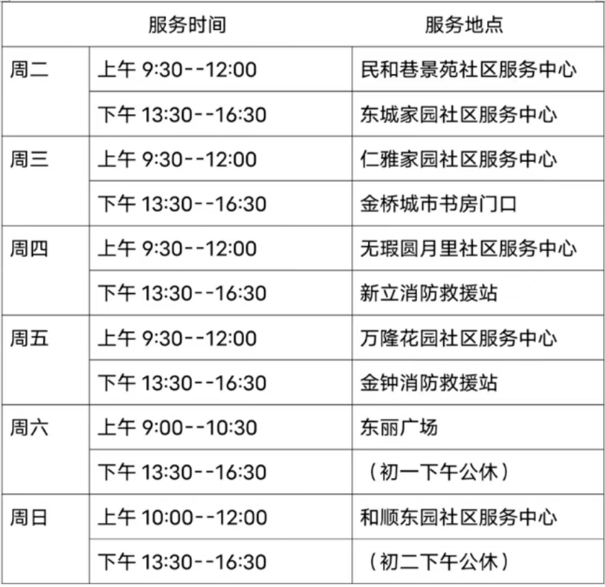 2月6日—2月11日东丽区图书馆流动服务车服务时间地点公布如下。社区、单位需要服务车上门服务请与杜俊老师联系,联系电话:18522291388。