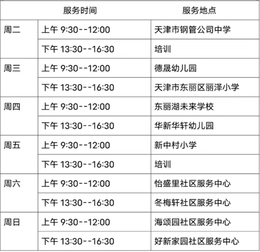5月14日—5月19日东丽区图书馆流动服务车服务时间地点公布如下。社区、单位需要服务车上门服务请与杜俊老师联系,联系电话:18522291388。