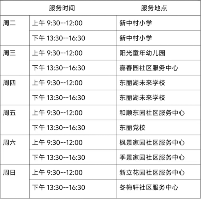 2月25日—3月2日东丽区图书馆流动服务车服务时间地点公布如下。社区、单位需要服务车上门服务请与杜俊老师联系,联系电话:18522291388。