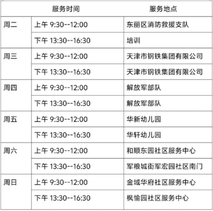 6月3日—6月8日东丽区图书馆流动服务车服务时间地点公布如下。社区、单位需要服务车上门服务请与杜俊老师联系,联系电话:18522291388。