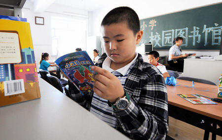 9月3日,一位学生在阅读图书。近日,哈尔滨市图书馆首家校园分馆在哈尔滨市香坊小学开馆。这家校园图书馆现有藏书2000余册,各类报刊70余种,除为校园学生提供阅读平台外,还将逐步对社区群众开放。