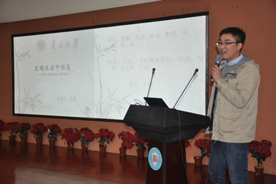 马博士主要从三个方面进行了讲述,第一、生活中美往往隐藏于纷繁复杂而又喧闹浮华的社会中,发现他们,需要有一双会审美的眼睛,也需要敏锐的捕捉和发现美的方法;第二、美并非总是“高大上”的,并非常人难以企及,大自然、艺术、建筑、影视、工艺中都蕴含着大量的美;第三、我们的祖先给后人留下了丰富的美的文物和审美艺术,古人的审美智慧在今天也可以发挥作用。发人深省的故事,鲜活生动的案例,深入浅出的带领同学们张开发现美的慧眼,开启了一次寻找美、发现美、欣赏美的审美之旅。