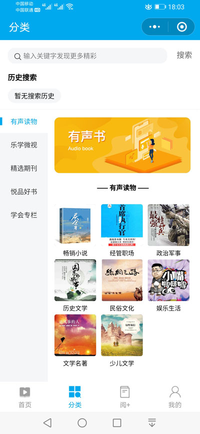 资源丰富涉及面广:涵盖文学历史、政治军事、经管科技、生活、少儿等等,从幼儿到老年人都能在该平台找到适合的阅读资源,特别针对宅在家的青少年儿童群体,平台乐视微学版块有创意手工、有声绘本、高清动画、国学经典、少儿科普、益智启蒙等视频资源,满足青少年儿童的学习需求。