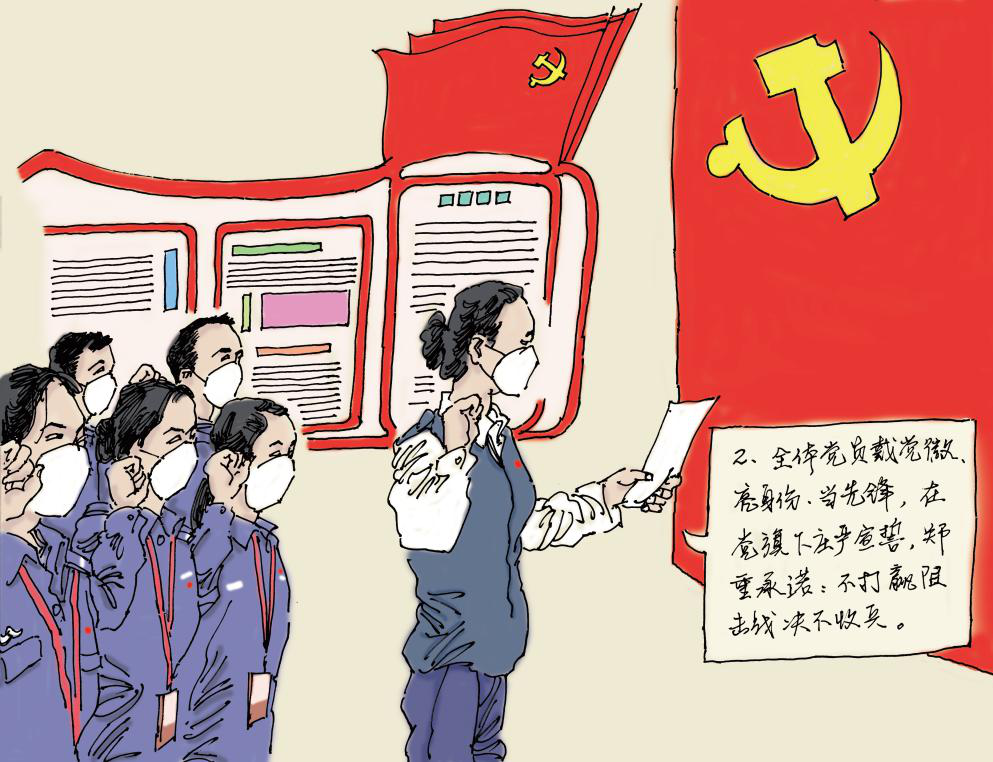 全体党员戴党徽、亮身份、当先锋,在党旗下庄严宣誓,郑重承诺:“不打赢阻击战决不收兵。”