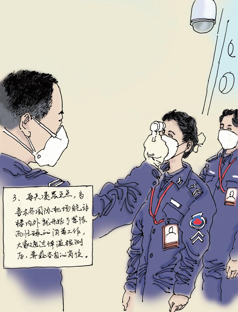 每天凌晨五点,乌鲁木齐国际机场航站楼内外就开始了紧张而忙碌的消毒工作,大家通过体温检测后,奔赴自己的岗位。