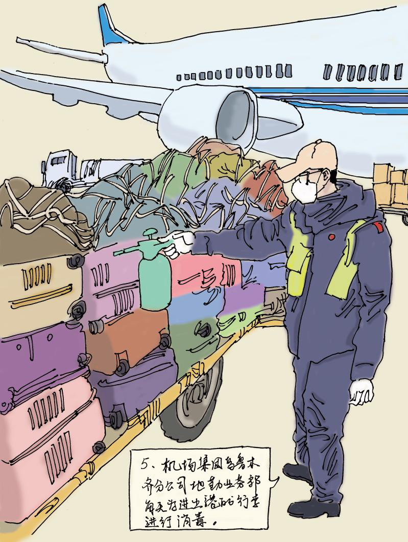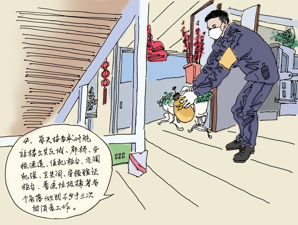 每天按要求对航站楼公共区域、廊桥、安检通道、值机柜台、空调机组、卫生间、安检验证柜台、普通垃圾桶等各个角落做到不少于三次的消毒工作。