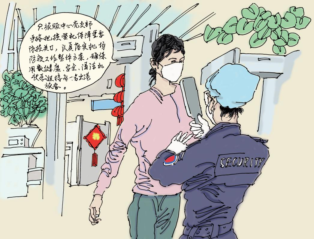 旅服中心党支部严格把控登记保障重要防控关口,认真落实机场防疫工作整体方案,确保用最健康、安全、清洁的状态迎接每一名出港旅客。