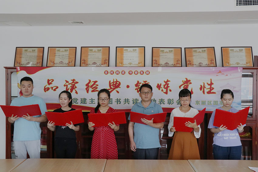 7月22日上午,东丽区图书馆五楼荣誉展室内,伴随着六位获奖者集体朗诵《共产党宣言》,“品读经典 锤炼党性”——党建主题图书共读活动表彰会拉开了帷幕。