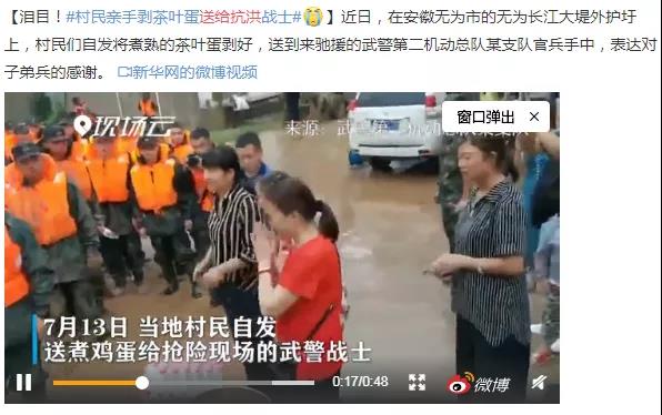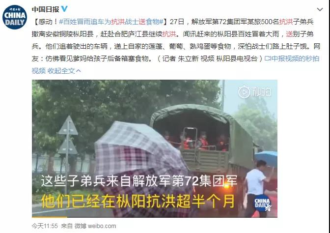 今年抗洪时,同样的一幕又出现了。百姓们冒着大雨为抗洪战士送食物。
