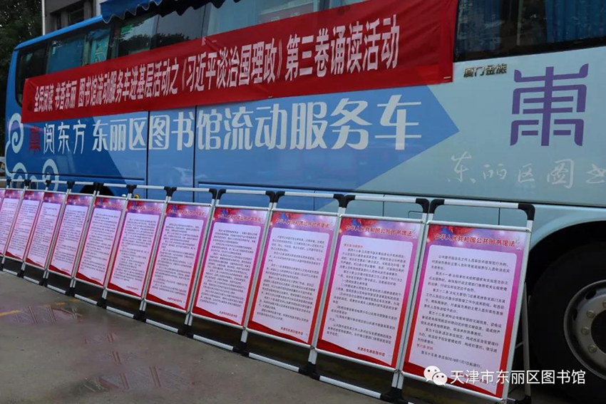 东丽区图书馆流动图书车作为图书馆总分馆建设的一部分,每年下基层600次,流动服务车将开进社区、部队、企业、机关、学校,助推书香东丽建设。