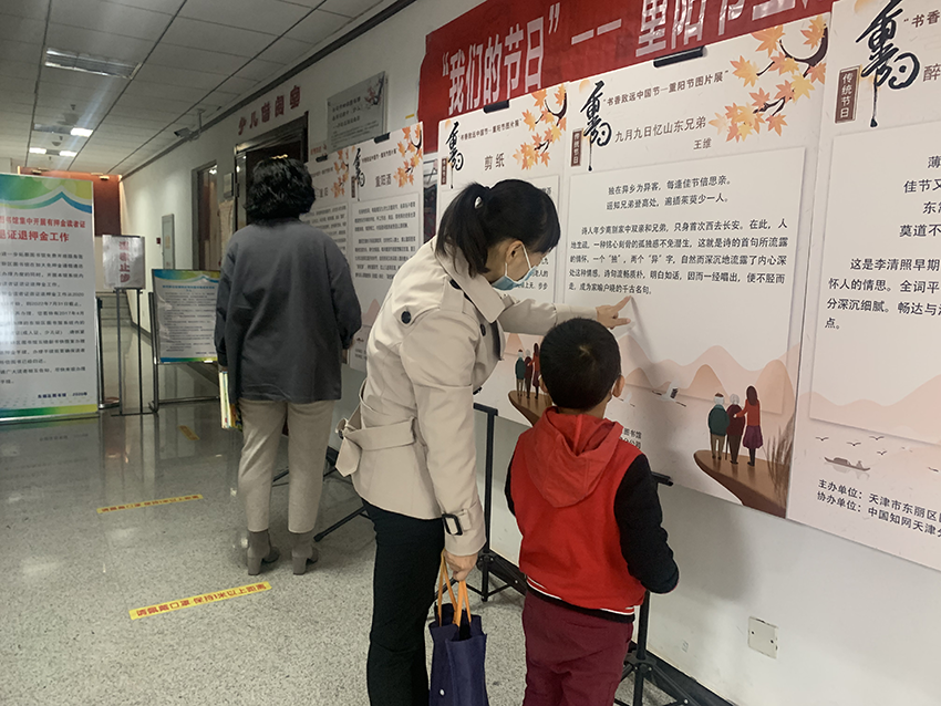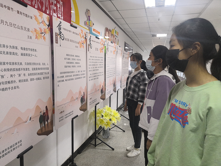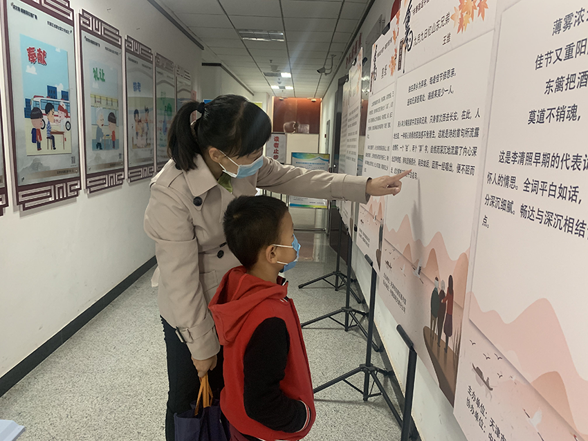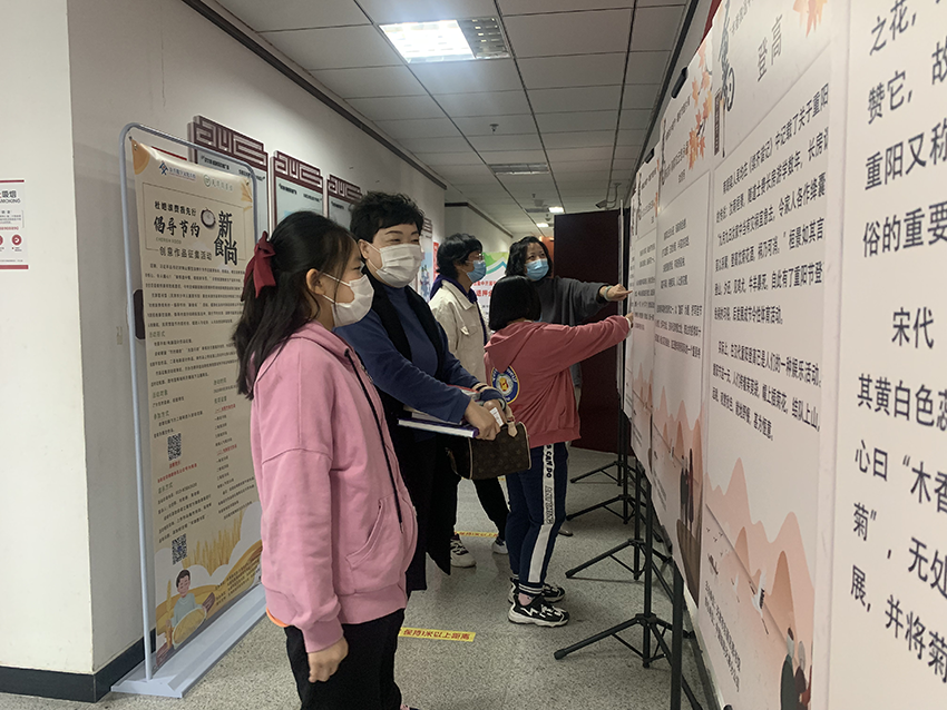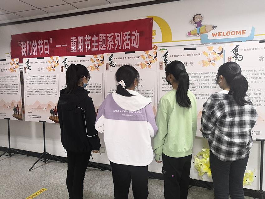 在重阳节来临之际,“我们的节日”——重阳节主题系列活动之“书香致远中国节——重阳节图片展”在我馆三楼少儿室外展出,内容包括重阳节的起源以及吃重阳糕、喝重阳酒、赏菊、登高、剪纸等传统习俗,并配有《过故人庄》、《九月九日忆山东兄弟》等重阳节相关的诗词,让读者进一步了解和认识中华优秀传统文化,吸引了不少读者驻足观看。