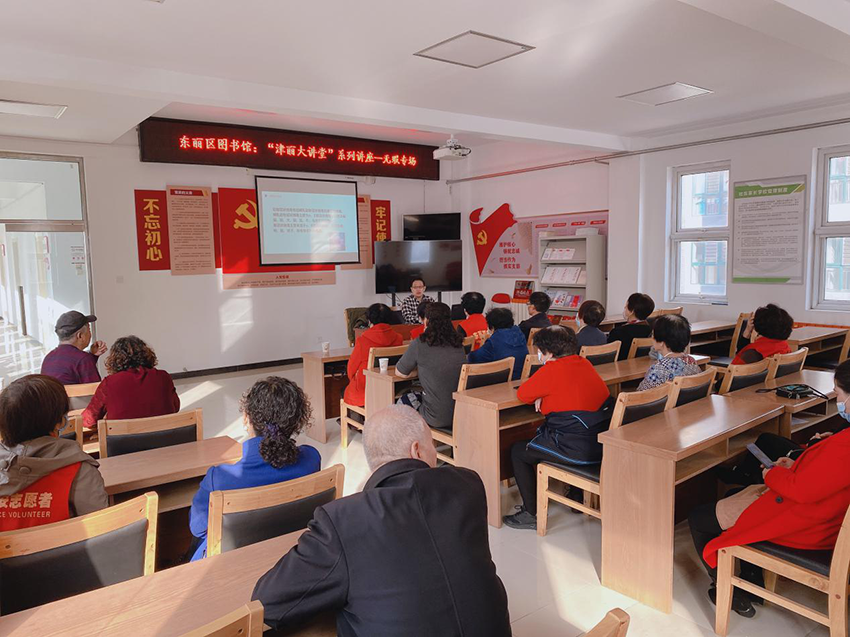 东丽区图书馆《津丽大讲堂》联合天津市社科联《理论超市》、天津图书馆《海津讲坛》特邀天津公安警官职业学院心理学教授刘援朝老师、天津中医药大学教授袁红霞老师、天津医科大学教授史宝欣老师分别于11月4日、11月6日在华盛里社区、军秀园社区、无瑕花园社区进行了题为《老年人角色变迁与自我调适》、《“全民健康”话养生》、《新冠肺炎居家防护与心理自助》的讲座,社区居民参加了讲座。