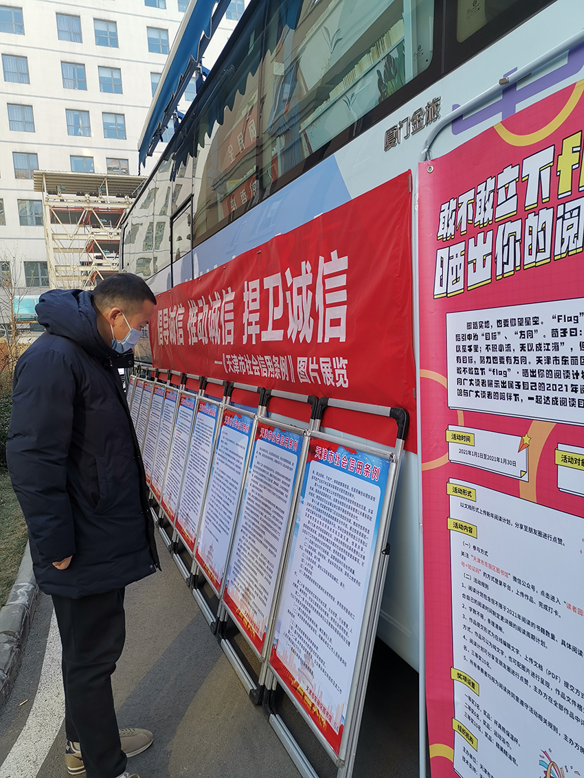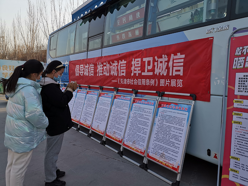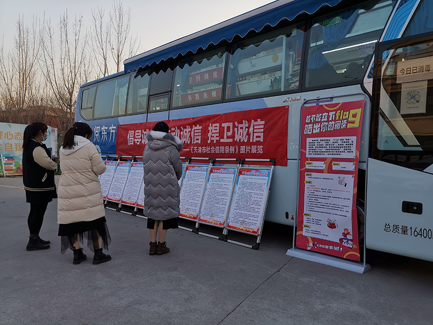 为深入贯彻落实《天津市社会信用条例》、《东丽区关于<天津市社会信用条例>宣传方案》,东丽区图书馆积极开展宣传活动,展出《天津市社会信用条例》内容的展板12张,并利用流动图书车在东丽区进行流动展览,众多读者驻足阅读学习,营造出学条列、用条列、守条列的浓厚社会氛围。