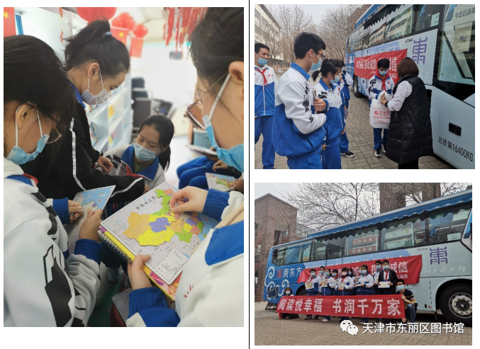 东丽区图书馆流动服务车开进耀华滨海学校进行送文化服务。