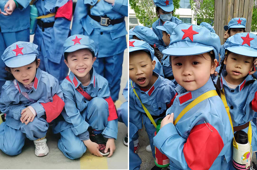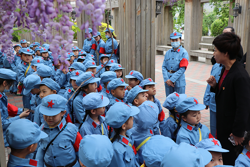 在紫藤花架下,穿红军服的孩子们的小脑袋簇在一起,岳立春副馆长对他们的到来表示热烈欢迎,随即介绍了今天的活动流程。