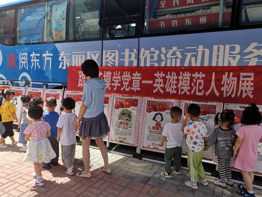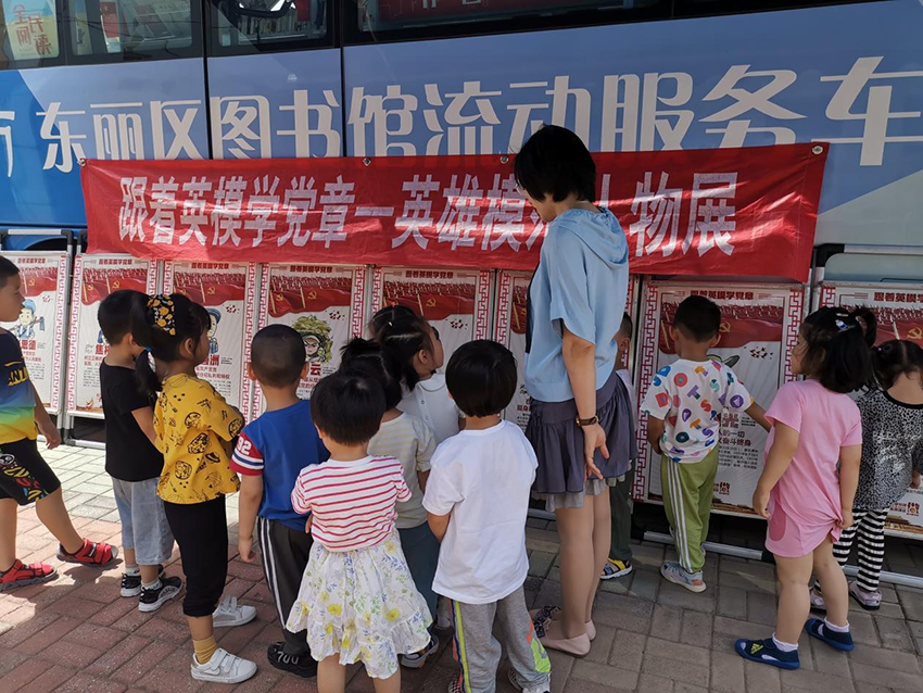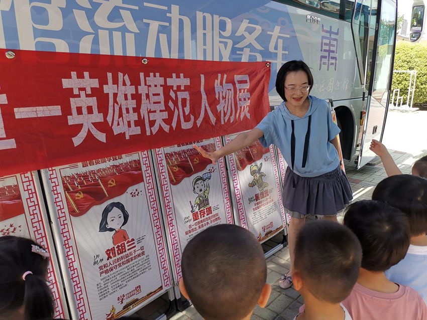 在图书车下,刘老师和小朋友们一起学习英雄模范人物,讲英雄故事,感受英雄舍身为国的伟大。