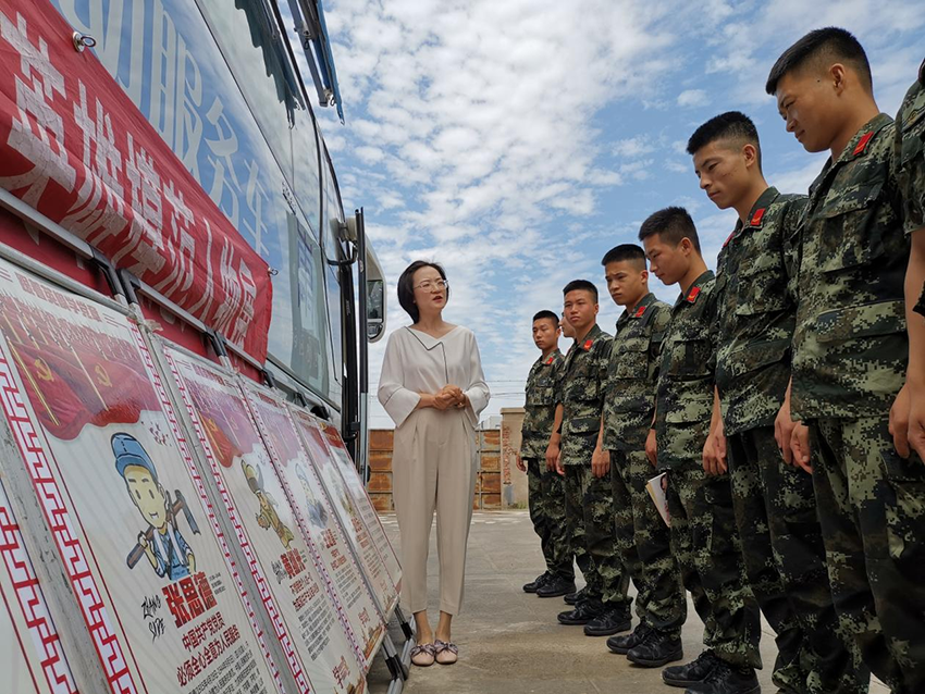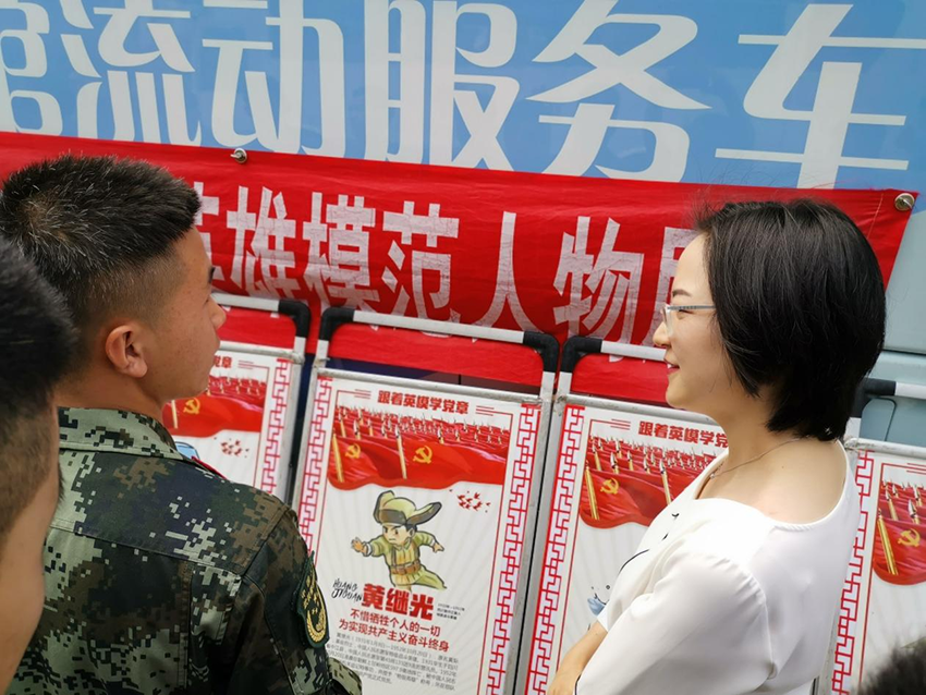 本周主题是,学英雄事迹,思考自我人生。刘容禾老师和战士们,站在图书车的英雄人物看板前,一起聊起英雄人物的光辉事迹。