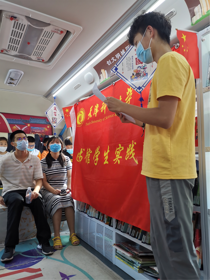 在流动服务车上,天津科技大学的李姝均同学带领小朋友们阅读绘本故事,以著名科学家南仁东为例,鼓励小朋友们要努力学习科学文化知识,立志报效祖国。