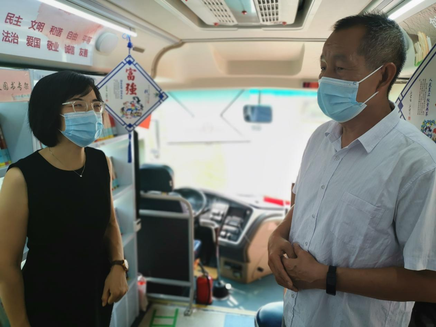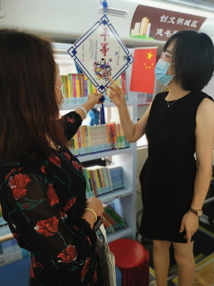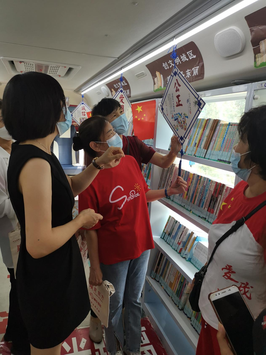 流动服务车的到来迎来了许多读者,大家纷纷上车进行参观,车内瞬间人气爆棚。刘容禾老师和大家在车上讨论“社会主义核心价值观”,大家各抒己见。