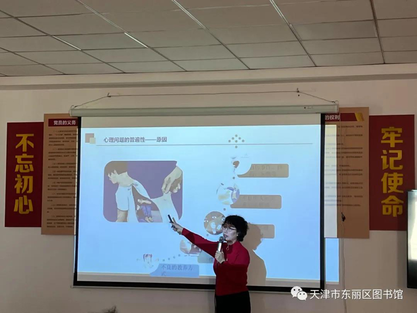 优良的心理素质在当代社会素质的提高中起着举足轻重的作用,为提高全体居民的心理素质,提升心理健康水平,普及心理知识,东丽区图书馆邀请中科院心理研究所心理学在读博士王东燕来到圆月里社区党群服务中心二楼会议室,为群众举办以“心理健康与调适”为主题的“津丽大讲堂”文化公益讲座。