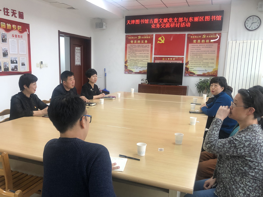 东丽区图书馆党支部书记、馆长张广明同志分别介绍了本馆人员构成、机构设置、分馆建设、购书经费、古籍收藏等情况。双方就文献资源建设、馆际互借、古籍文献鉴定等内容进行了深入探讨。