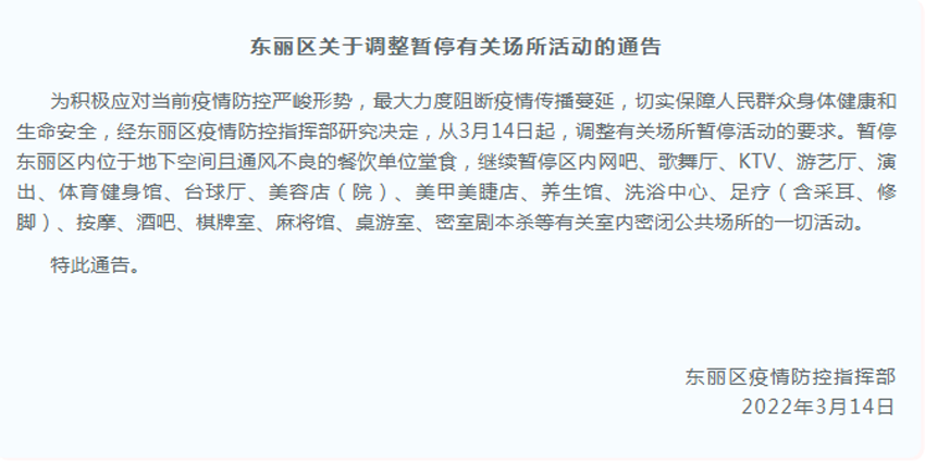 3月14日,东丽区关于调整暂停有关场所活动的通告
