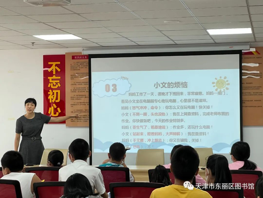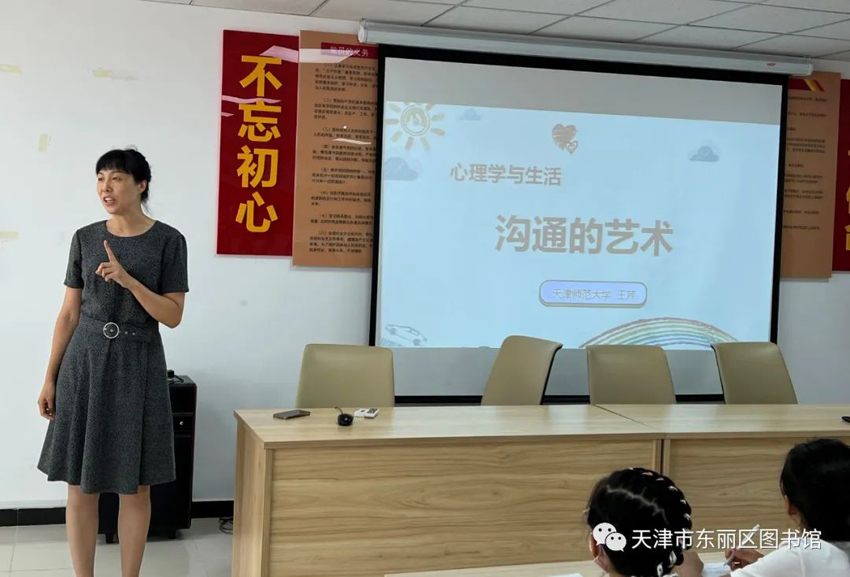 为搭建家长与孩子之间心灵的桥梁,增进家长与孩子的联系和感情,建立良好亲子关系及优良的家庭环境,8月23日上午东丽区图书馆来到新立街丽昕社区党群服务中心一楼活动室,邀请到天津师范大学心理学部副研究员、硕士导师王芹为居民们举办了一场以“沟通的艺术”为主题的“津丽大讲堂”文化公益讲座。