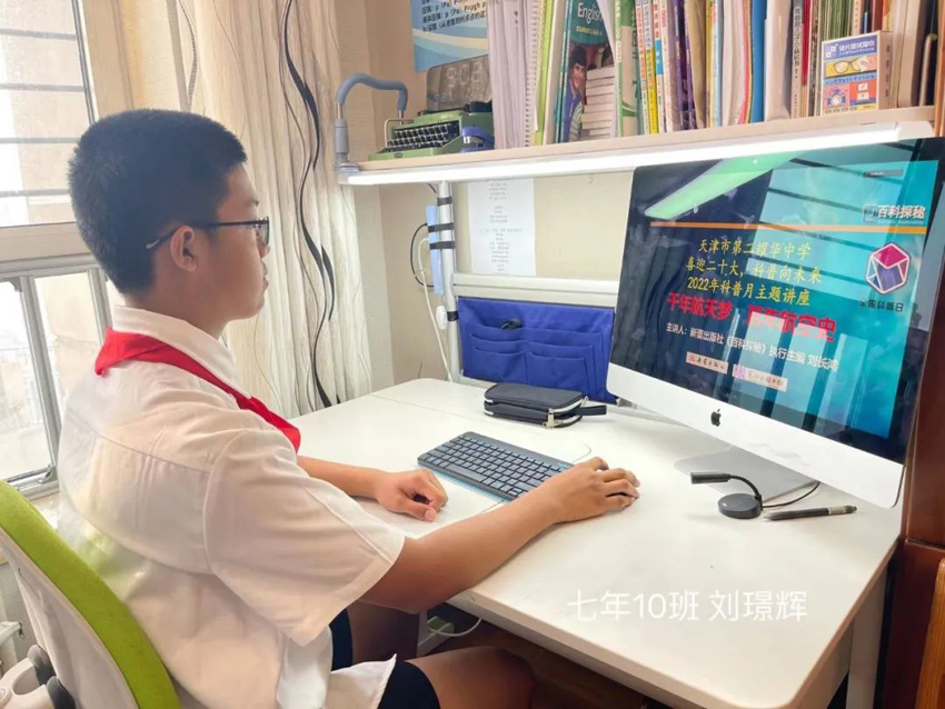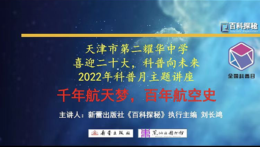 9月26日下午,东丽区图书馆联合新蕾出版社组织的内容精彩的航空史讲座在第二耀华中学成功举办。此次邀请的授课专家是新蕾出版社《百科探秘》杂志执行主编刘长鸿老师,通过腾讯会议,他为500名师生带来了一场以“千年航天梦  百年航空史”为主题的“津丽大讲堂”科普公益讲座。