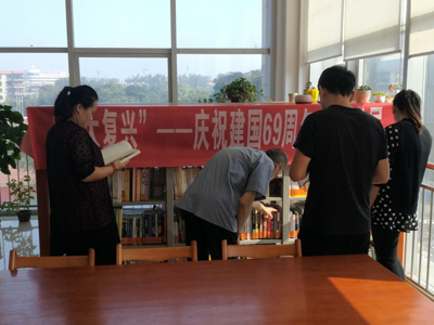 为庆祝建国69周年,东丽区图书馆开展国庆专题新书展,给广大读者提供更多的优质阅读资源,进一步丰富节日期间群众精神文化生活,引导广大读者树立强烈的民族自尊心、自信心和自豪感,激发人们同心共筑中国梦的热情和力量。