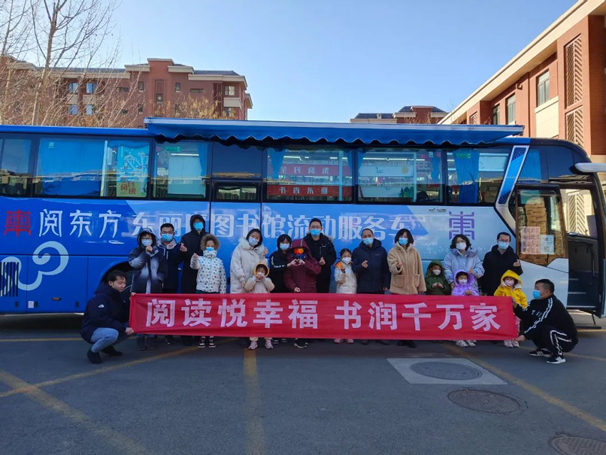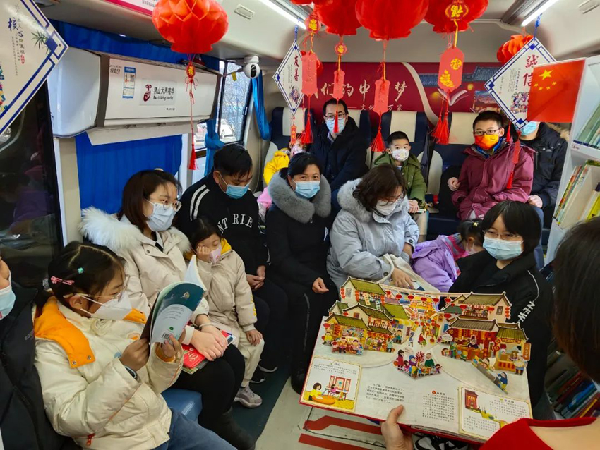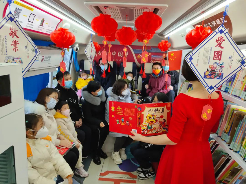 2023年1月22日,东丽区图书馆图书车开进金域华府社区,开展了“阅读悦幸福·书润千万家”——《欢乐中国年》共读绘本之兔年新春主题亲子阅读活动。