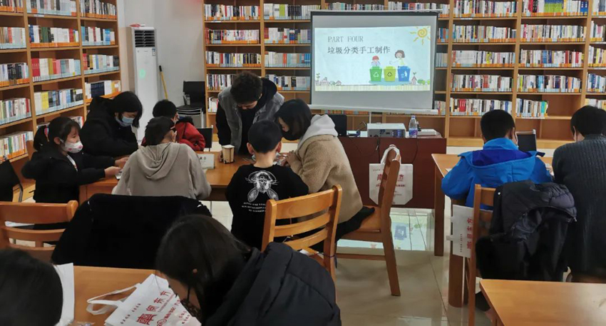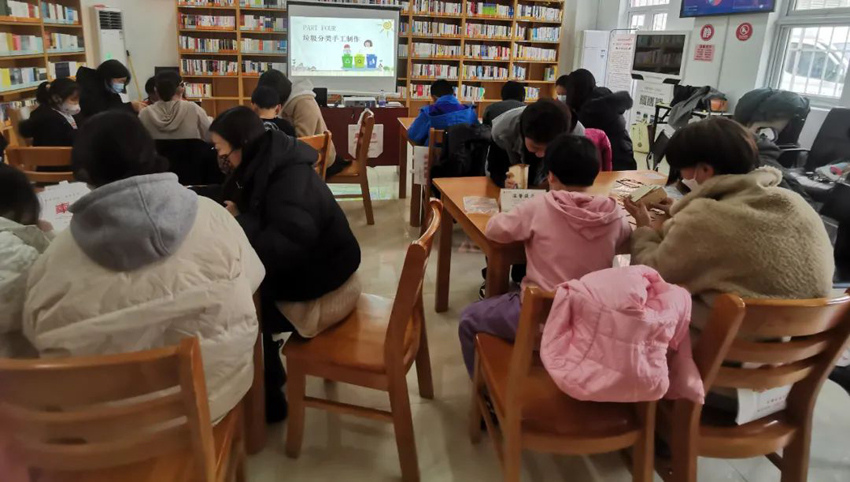 活动中,图书馆工作人员为大家讲述了建设文明城区以及垃圾分类等环保内容,呼吁大家重视垃圾分类,养成垃圾分类的好习惯,合理利用资源,保护我们赖以生存的环境。随后,工作人员为大家发放材料包,带领大家制作简易垃圾分类回收箱,在动手中学习环保知识,助力文明城区的建设。