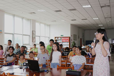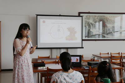 讲座中,舒老师向在场家庭介绍了立秋的气候、习俗、农事、养生的相关常识,对《故都的秋》的段落进行了详细地讲解,带大家在郁达夫清新灵秀、质朴真挚的文字中领略秋的意境,并推荐了《不可不知的二十四节气常识》、《新岁时歌 古诗词中的二十四节气》等关于节气的书籍。随后,在场小朋友起立朗诵了古诗《秋日后》。